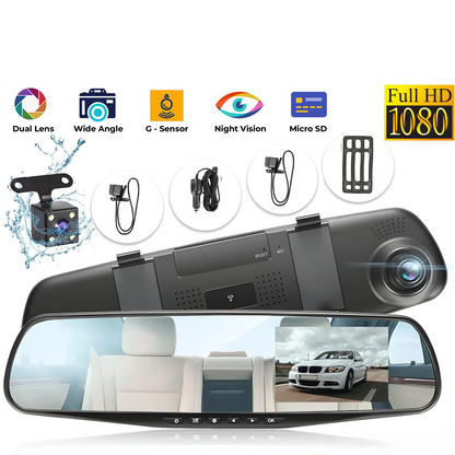 Upgrade your driving experience with this 1080P Dual Dash Cam Mirror, featuring full HD front and waterproof rear cameras, G-sensor protection, loop recording, and a crisp 4.3" display built directly into your rearview mirror.